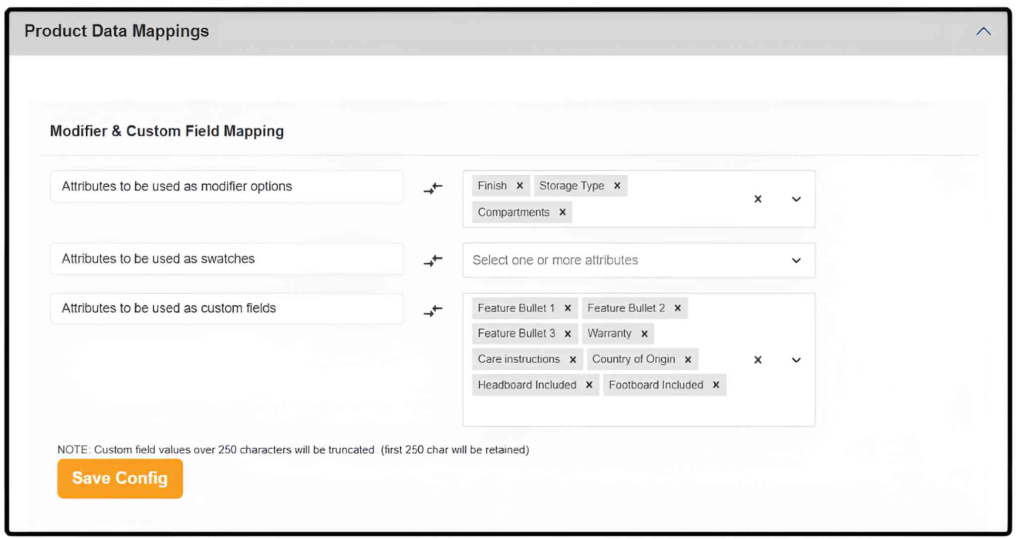 Map PIM attributes to be synced as a Modifier Option and Custom Fields in BigCommerce.